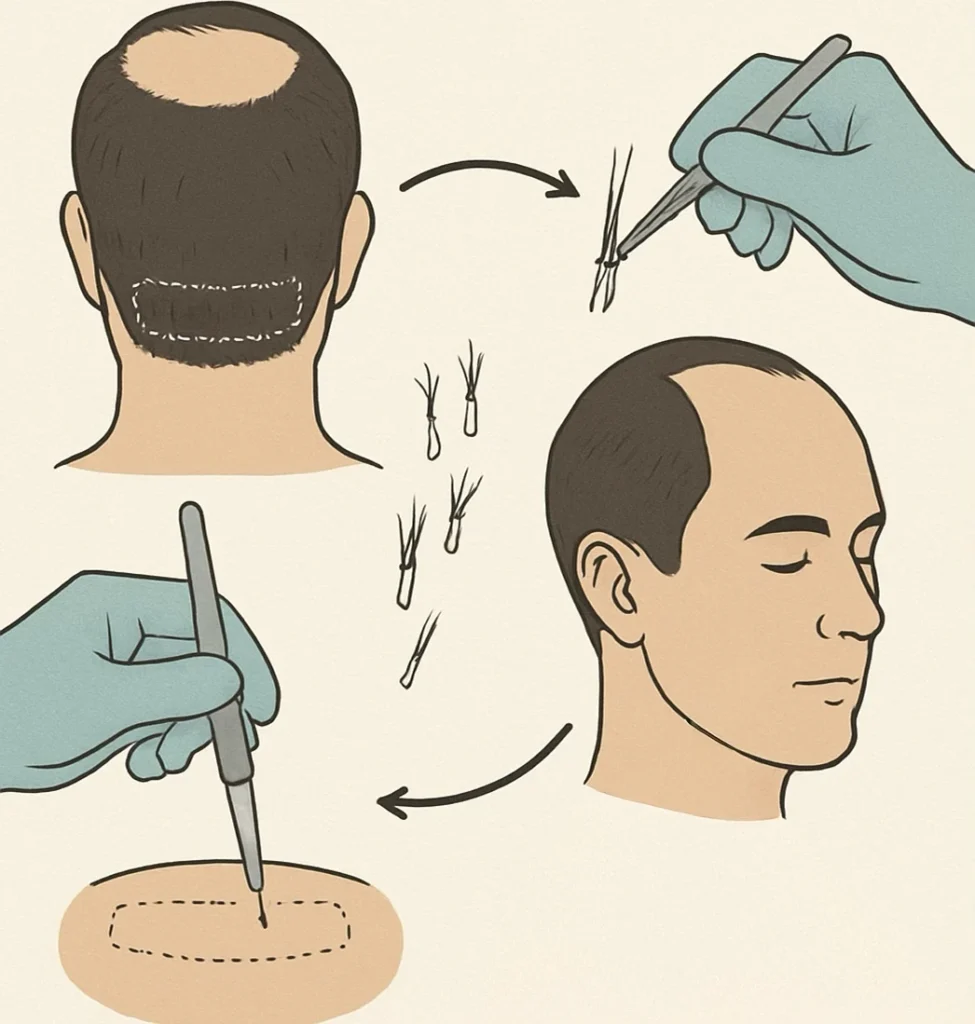 - Techniques like FUE (Follicular Unit Extraction) or FUT (Follicular Unit Transplantation)